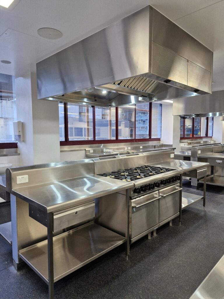 The project included a range of preparation, cooking and refrigeration areas across both kitchens, with multiple individual student cooking stations throughout the space. Each station was fitted with its own dedicated canopy system, allowing students to operate independently while maintaining proper ventilation and safety standards.