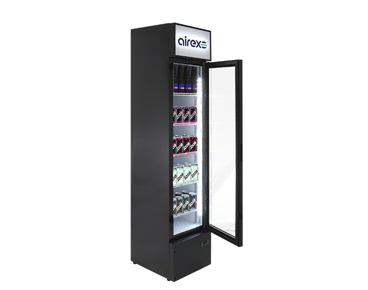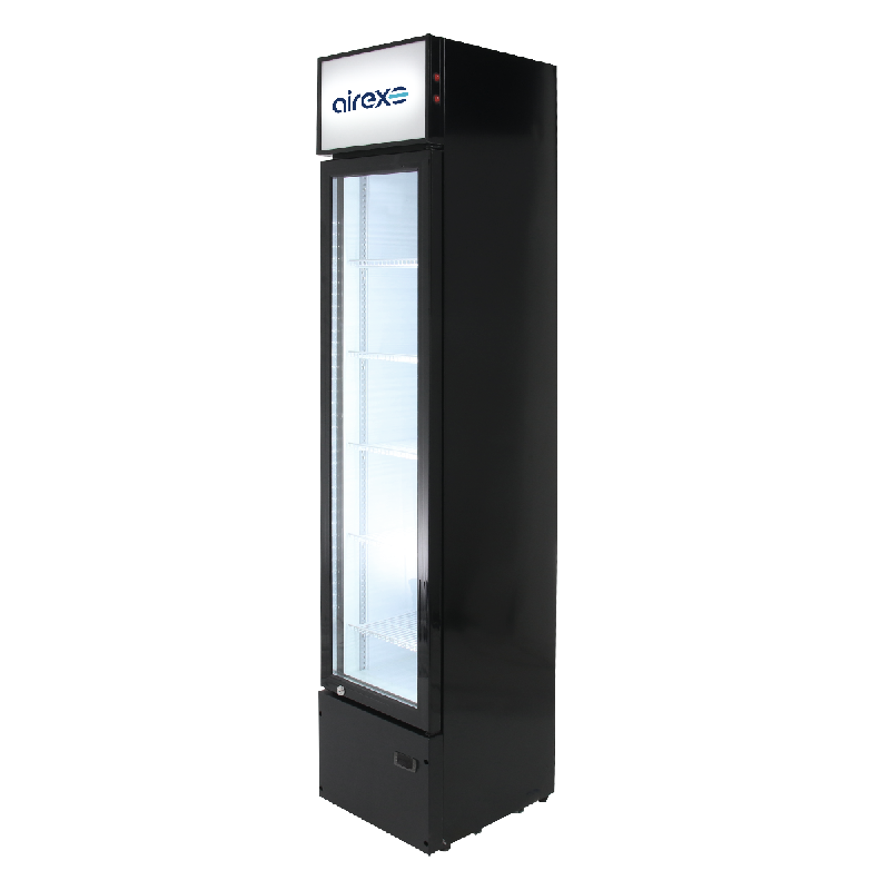 Airex Single Glass Door Chiller, 160Lt Vertical Slimline Merchandiser with Lightbox. Finished in Black. (10A)