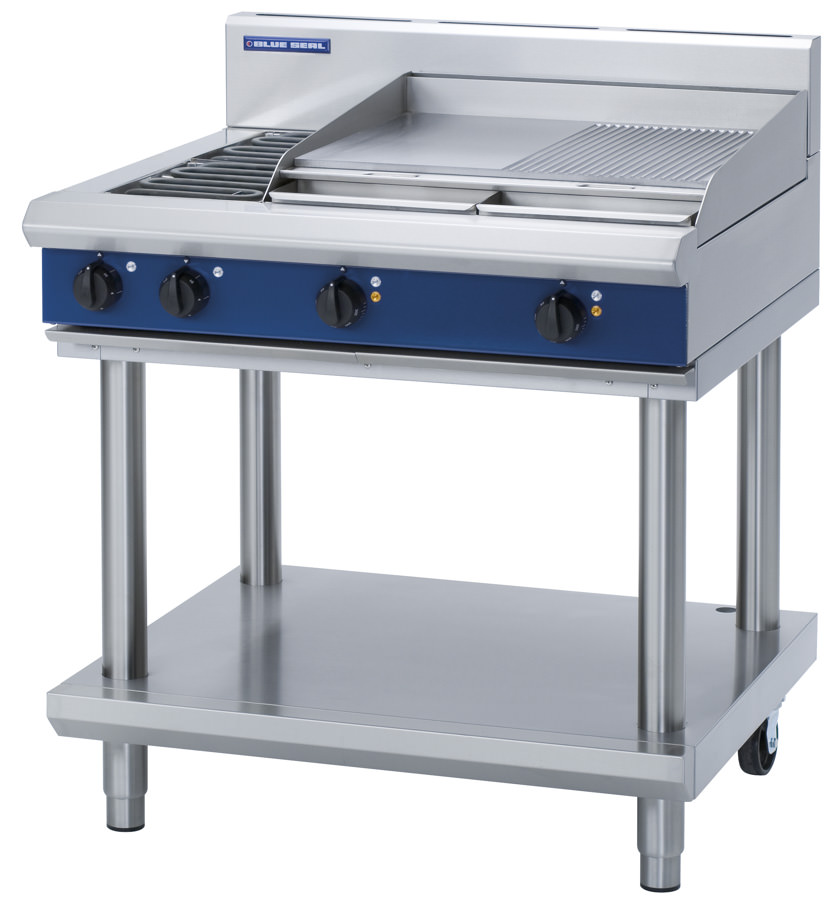 Blue Seal Black Series 900mm Modular Electric Combination 2 Element Cooktop with 600mm Griddle on Leg Stand.