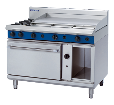 Home Shop Commercial Cooking Equipment Griddles & Flatplates With Oven Blue Seal Black Series G508A 1200mm Gas Combination 2 Burner Cooktop with 900mm Griddle on 2/1 GN Oven. (LPG Gas)