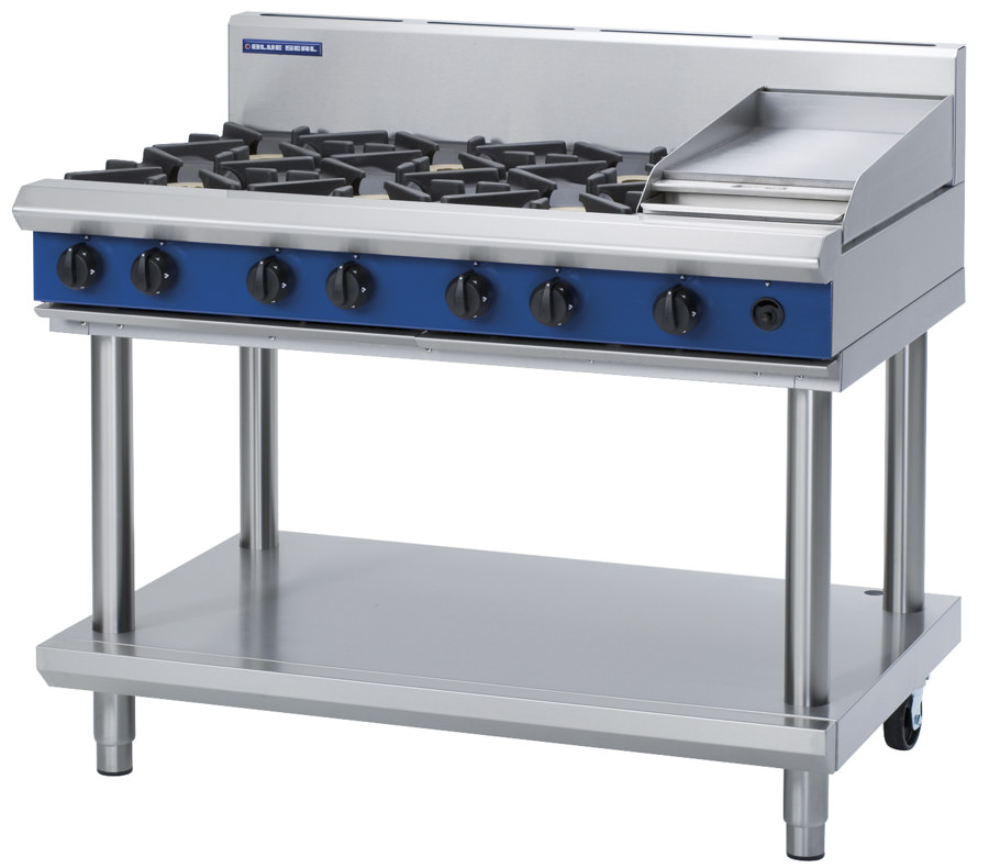 Blue Seal Black Series 1200mm Modular Gas Combination 6 Burner Cooktop with 300mm Griddle on Leg Stand. (NAT Gas)