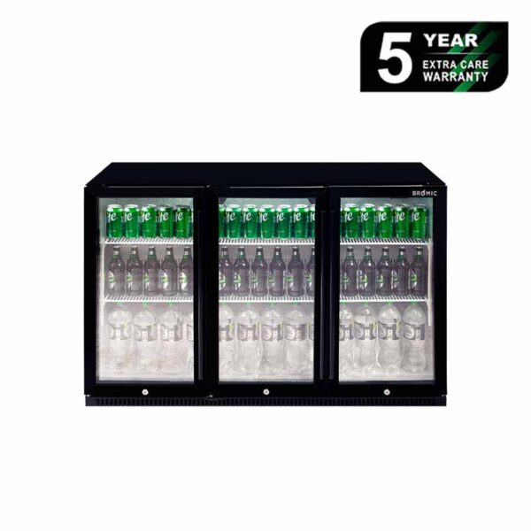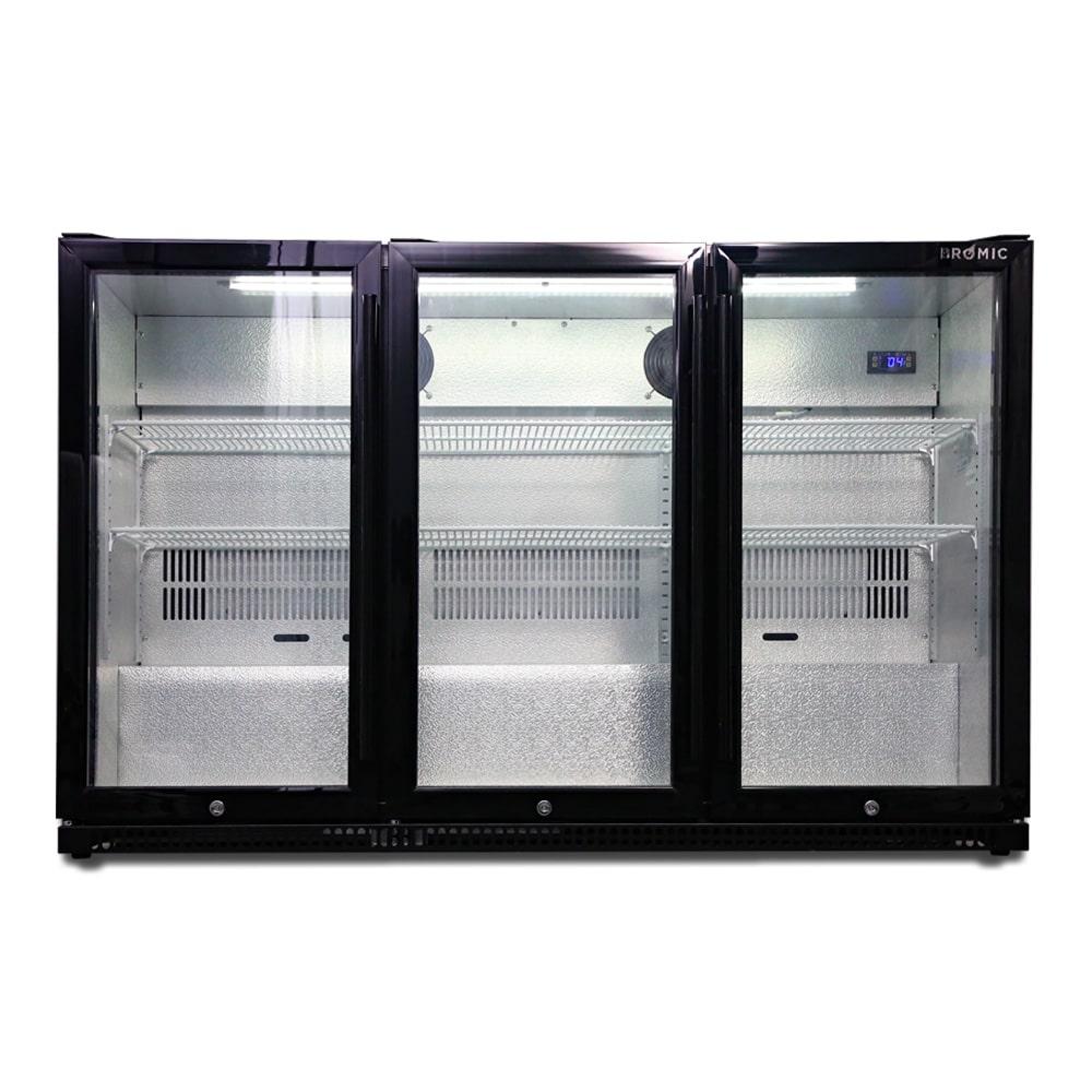 Bromic Three Glass Hinged Door, 307Lt Back Bar Display Fridge. Finished in Black. (10A)