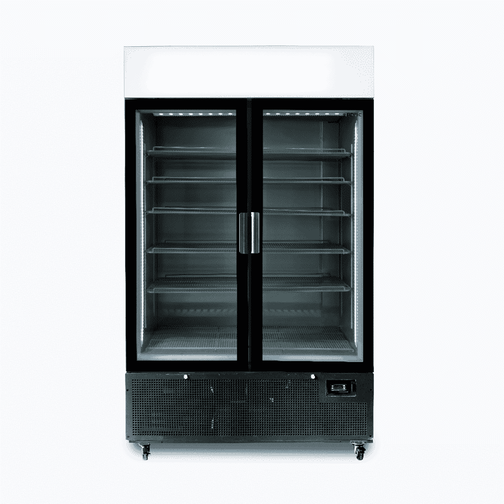 Bromic GM Series Two Flat Glass Door, 1082Lt Vertical Display Fridge with Lightbox. Finished in Black. (10A)
