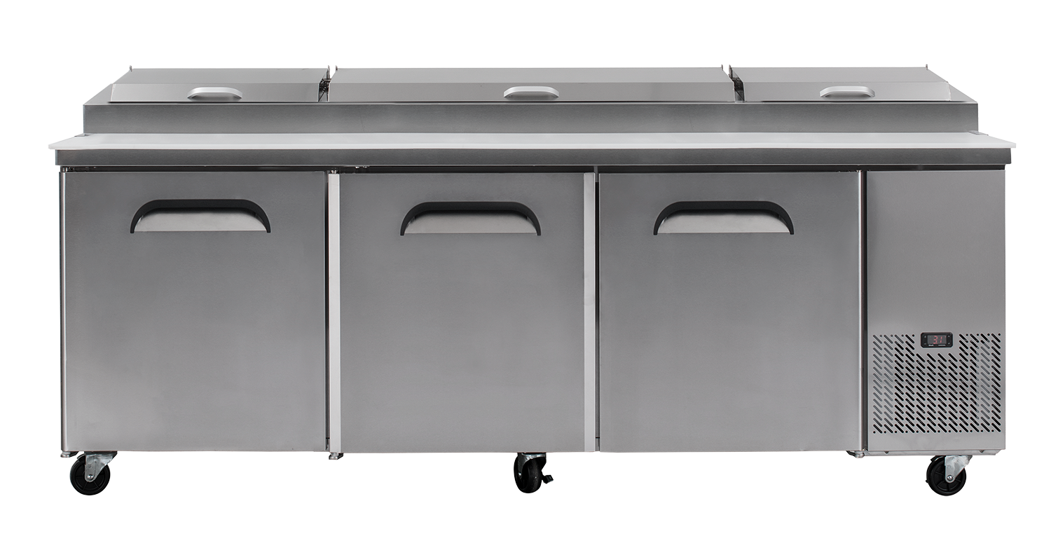 Bromic Three Solid Door, 873Lt with 12 x 1/3 GN Pizza Prep Counter Fridge. Finished in Stainless Steel. (10A)