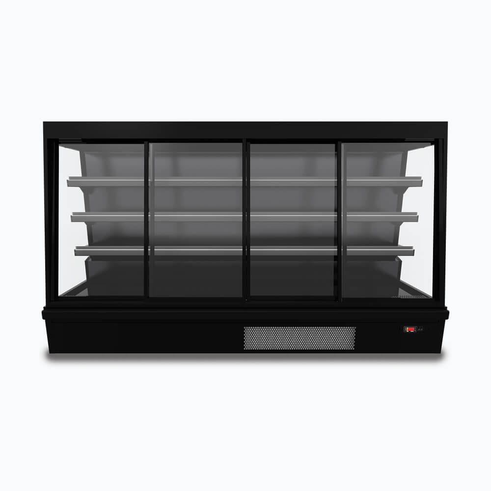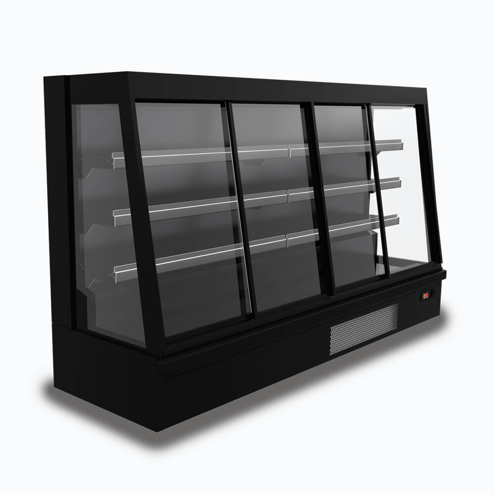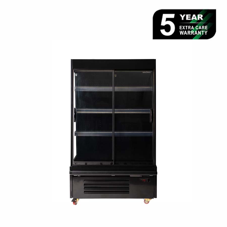 Bromic Two Sliding Doors, 938mm, 332Lt Semi Vertical Multideck Display Fridge. Finished in Black. (10A)