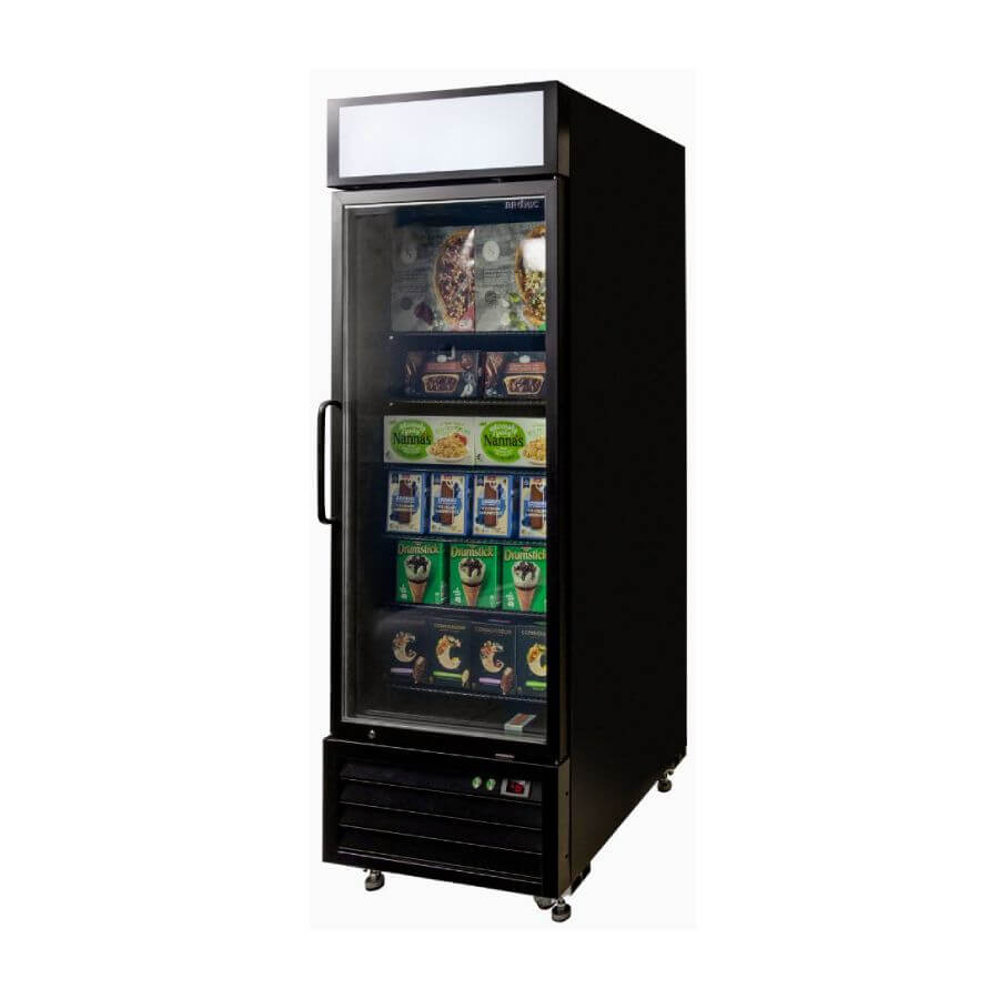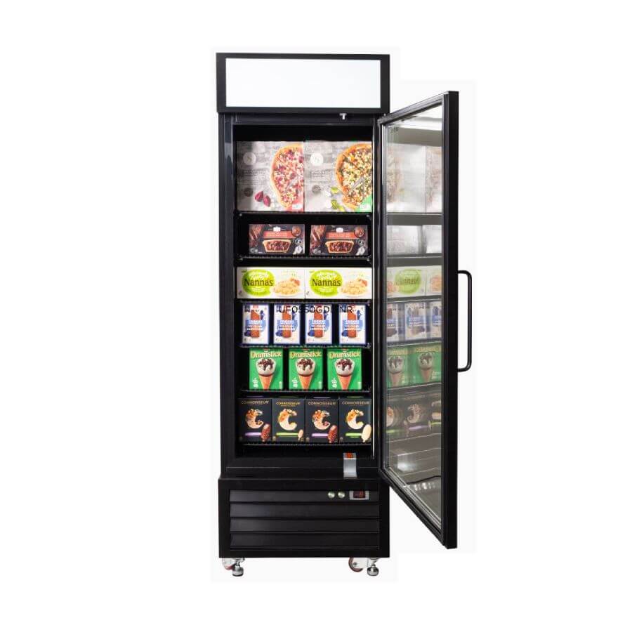 Bromic Single Flat Glass Door, 546Lt Vertical Display Freezer with LED Lightbox. Finished in Black. (10A)