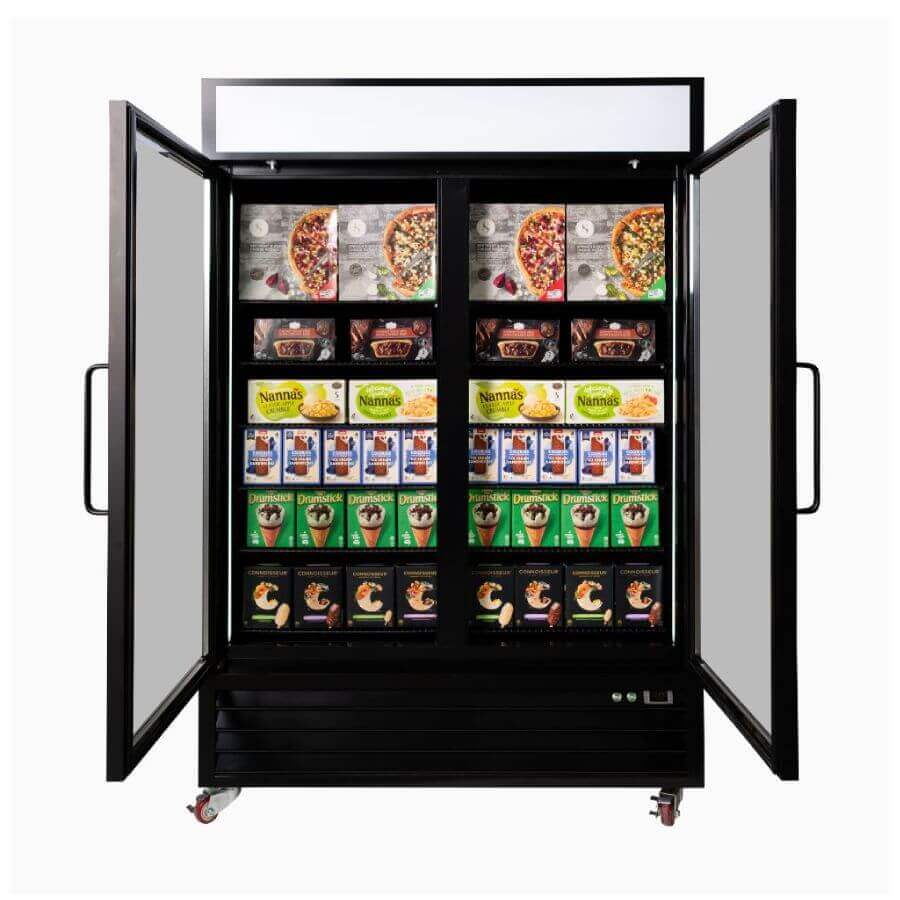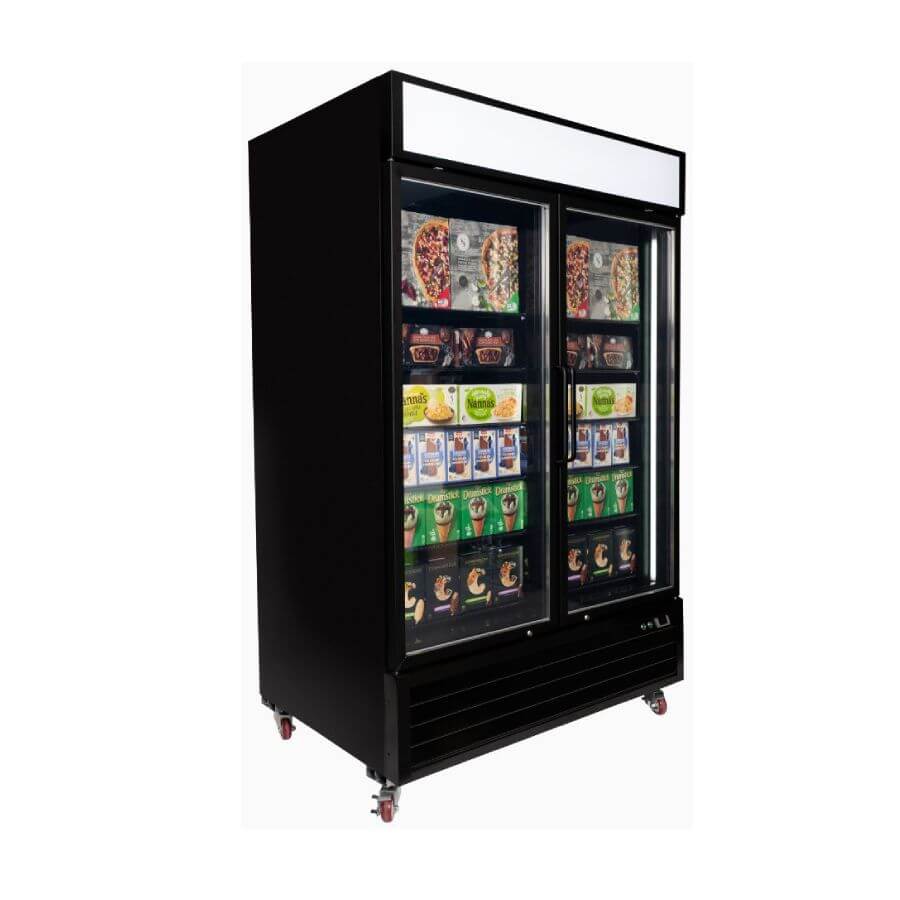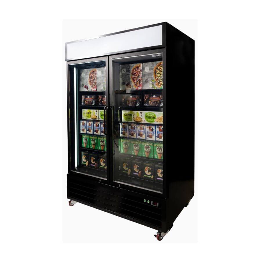 Bromic Two Flat Glass Door, 1266Lt Vertical Display Freezer with LED Lightbox. Finished in Black. (10A)