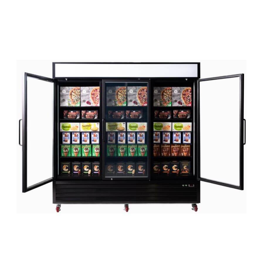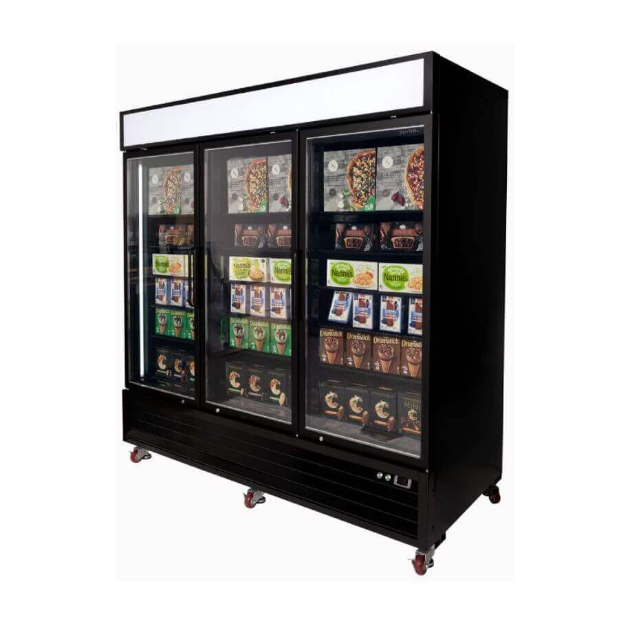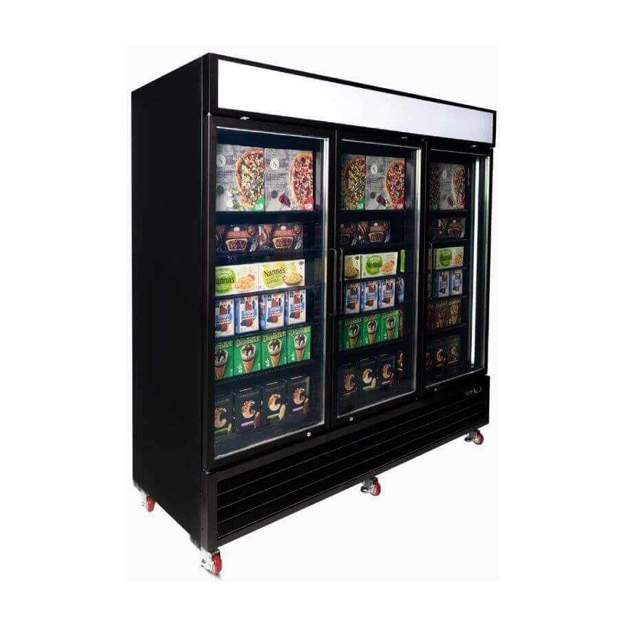 Bromic Three Flat Glass Door, 1980Lt Upright Display Freezer with LED Lightbox. Finished in Black (10A)