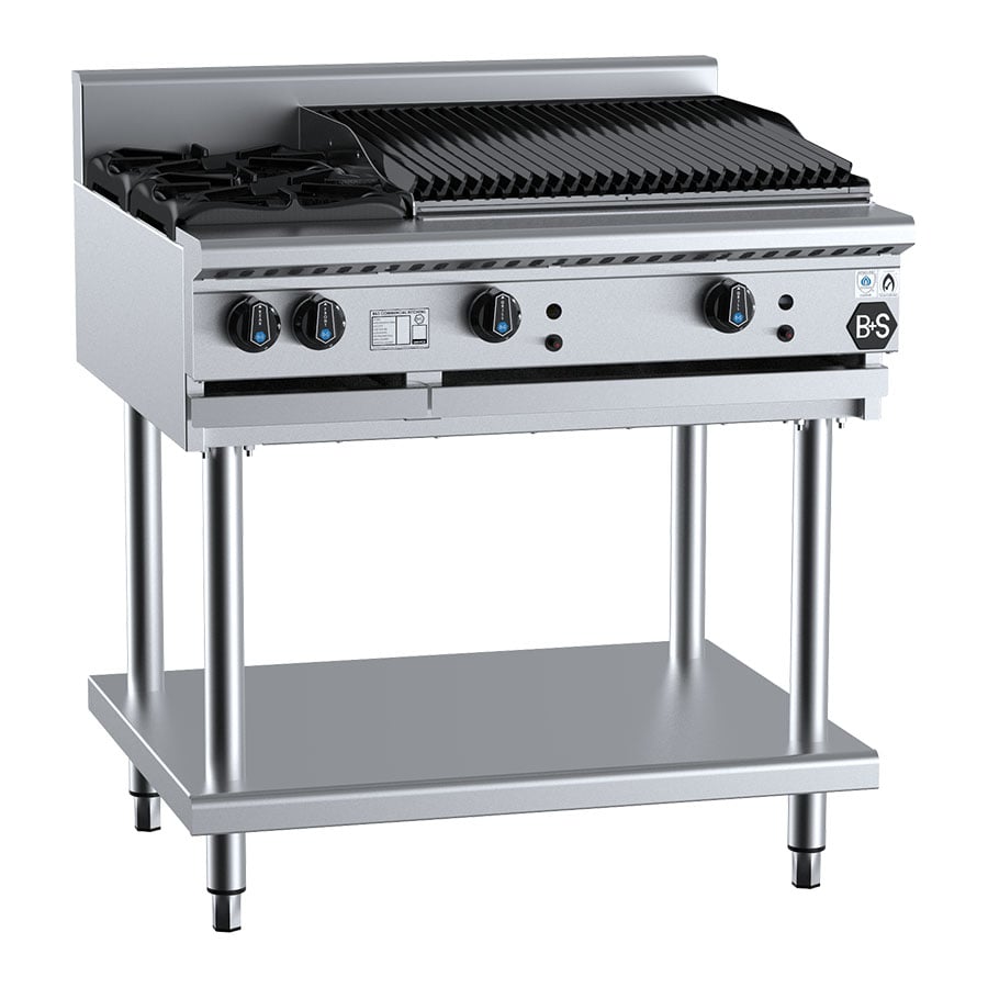 B&S Combination 2 Burner & 600mm Char Broiler with Open Stand and Undershelf. (LPG Gas)