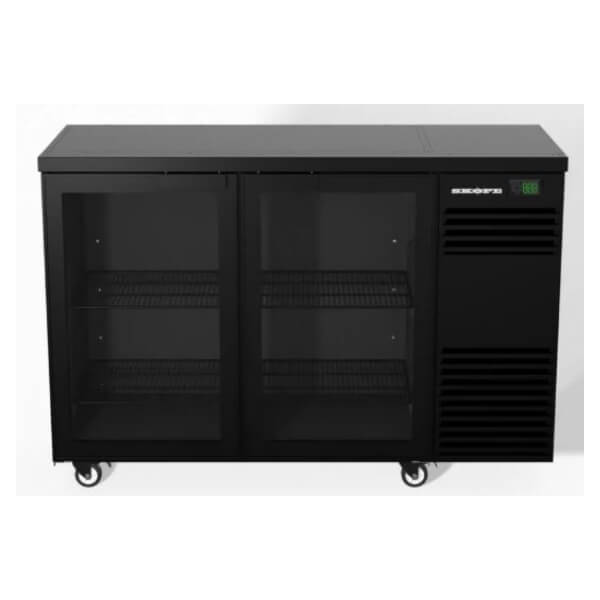Skope Back Bar Series Two Glass Swing Door, 410Lt Self Contained Undercounter Backbar Fridge with RH Services. Finished in Black. (10A) Serial # A220511945