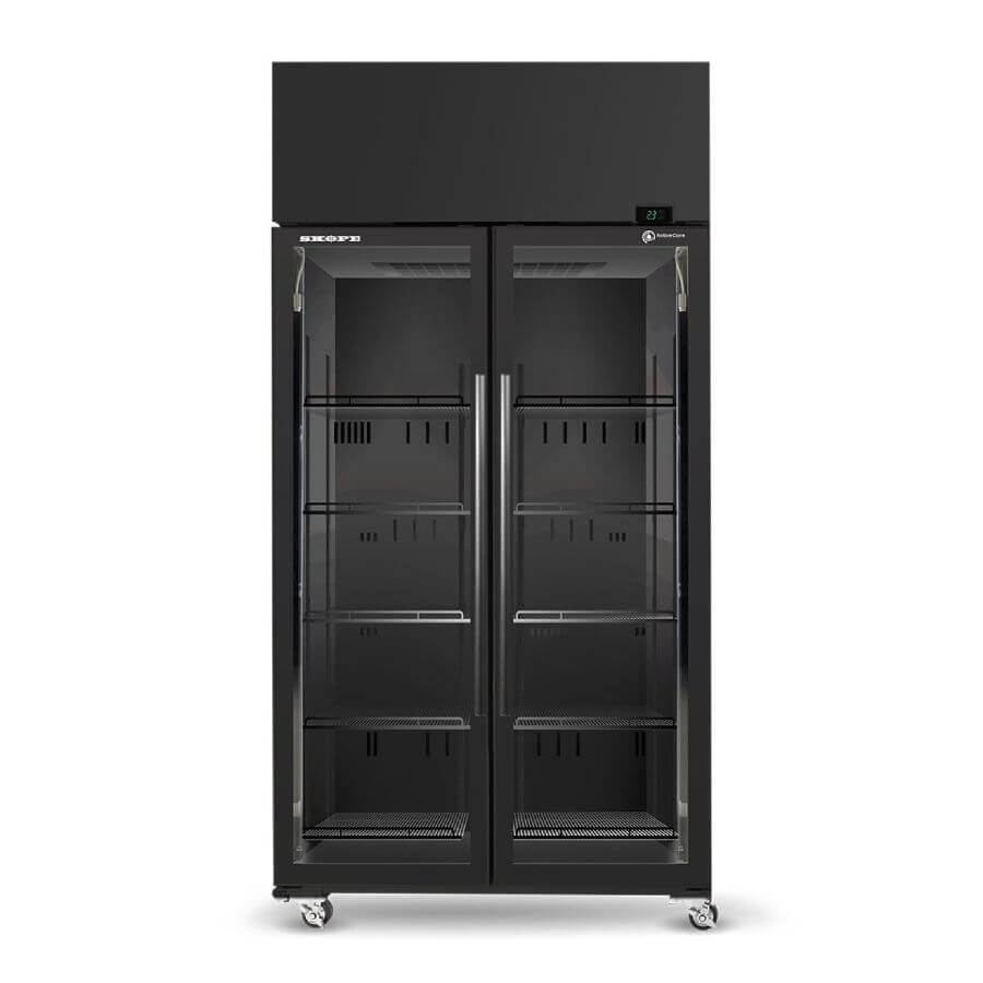 Clearance Skope SKT Active Core 2 Series Two Glass Swing Doors, 896Lt Self Contained Vertical Freezer with Top Mount Motor. Finished in Black. (10A) ** Slightly Dented Top Panels, Full MF Warranty**