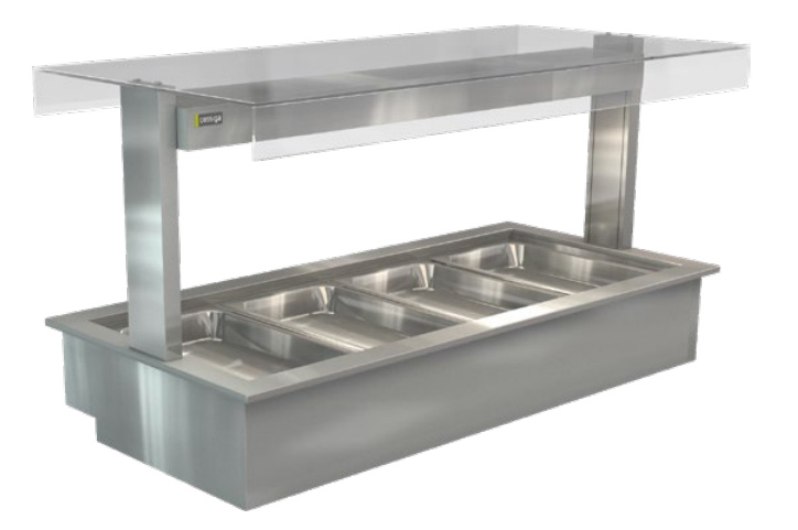 Cossiga Linear Series 4 x 1/1 GN Heated Bain Marie Buffet Display with Flat Top Sneeze Guard Glass.