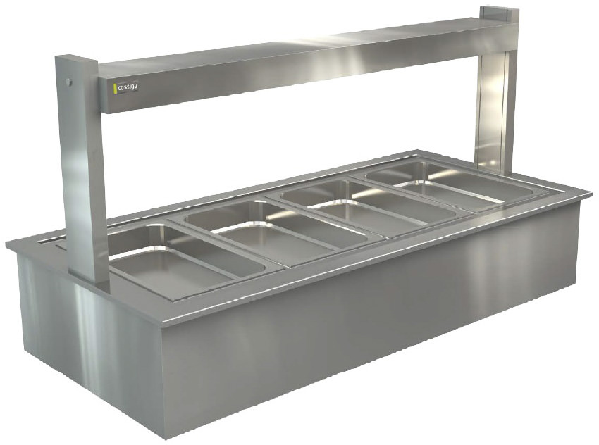 Cossiga Linear Series 4 x 1/1GN Heated Bain Marie Buffet Display with Overhead Halogen Heating. (20A)