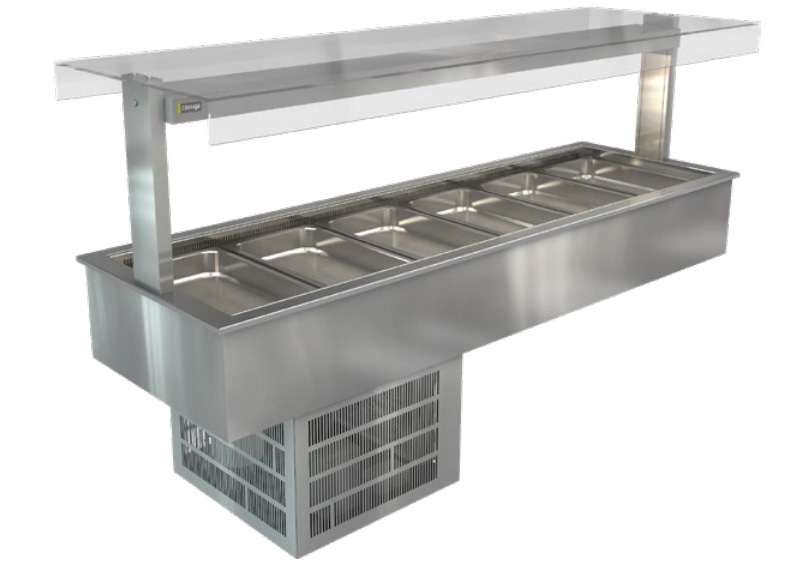 Cossiga Linear LS Series 6 x 1/1GN Drop In Refrigerated Cold Well with Flat Top Sneeze Guard Glass. (10A)