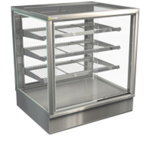 Cossiga Tower STG Series 900mm, 4 Tier Square Glass Heated Countertop Food Display with Fixed Front and Rear Sliding Glass Doors . Finished in Stainless Steel. (10A)