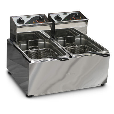 Roband F Series Twin Pan Countertop Electric Deep Fryer with 2 x 8Lt Tanks. Production Rated at 20kg/hr (2x15A)