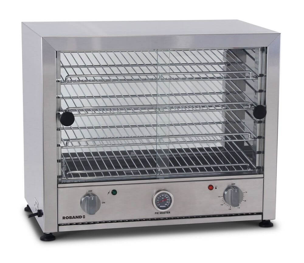Roband PM Series 50 Pie Capacity Countertop Square Topped Pie and Food Warmer with Single Side Glass Door.