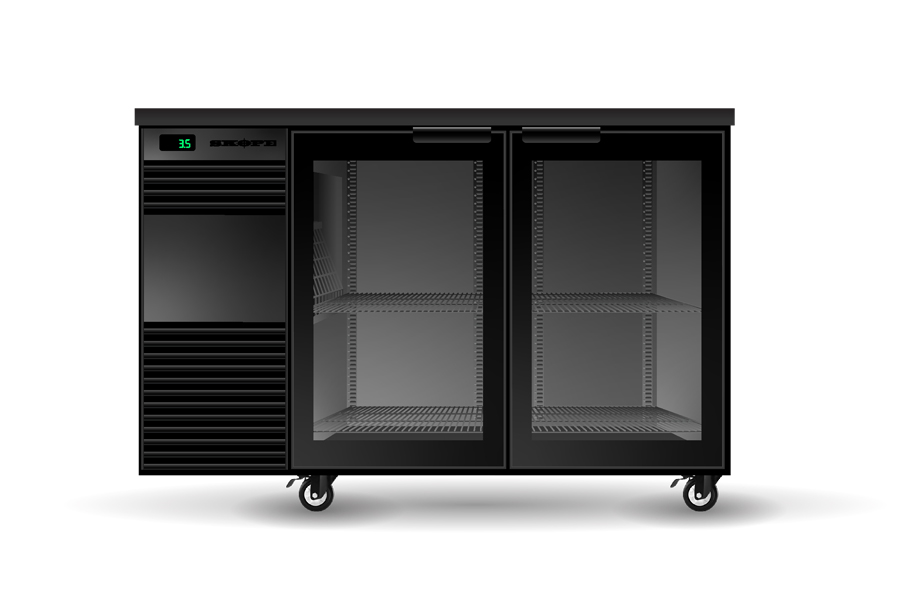 Skope Back Bar Series Two Glass Swing Door, 410Lt Self Contained Undercounter Backbar Chiller with RH Services. Finished in Black. (10A)