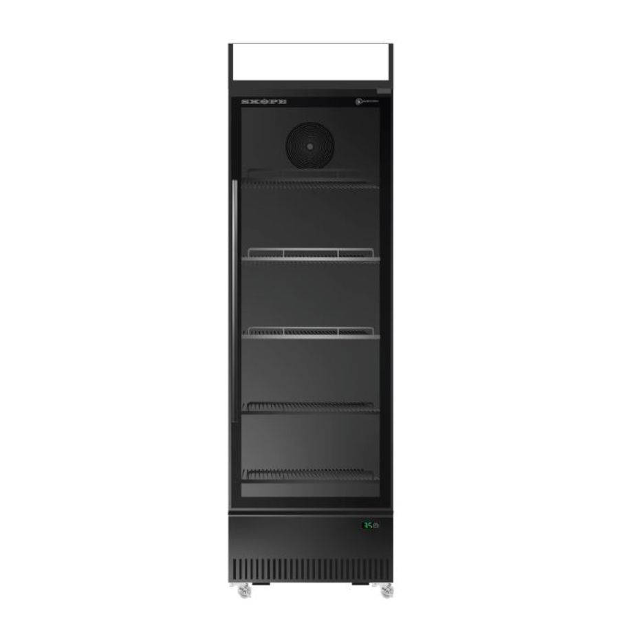 Skope BME Active Core Slimline Series Single Glass Door, 340Lt Self Contained Vertical Chiller with Bottom Mounted Compressor. Finished in Black.