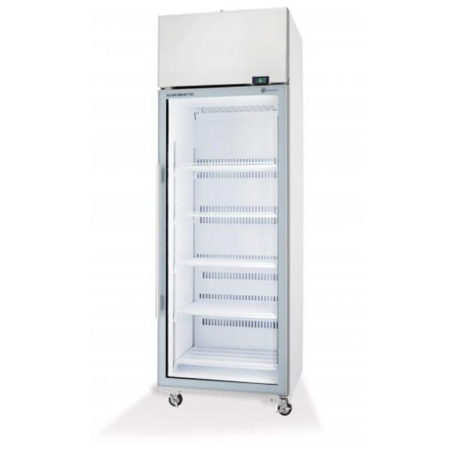 Skope TCE Series Single Glass Door, 557Lt Capacity Self-Contained Vertical Display Chiller with Top Mounted Motor. Finished in White. (10A)