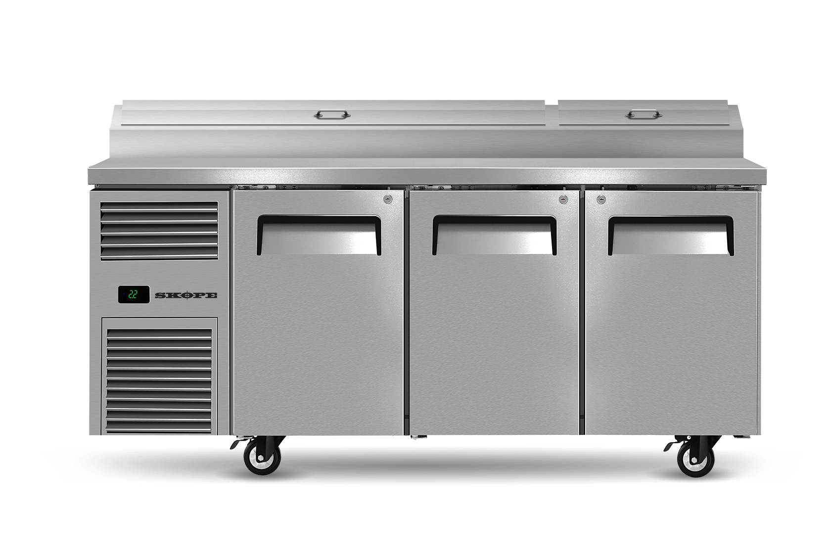 Skope Reflex Series 3 Solid Door, 523Lt Pizza Preparation Chiller with Side Mounted Motor. Finished in Stainless Steel.
