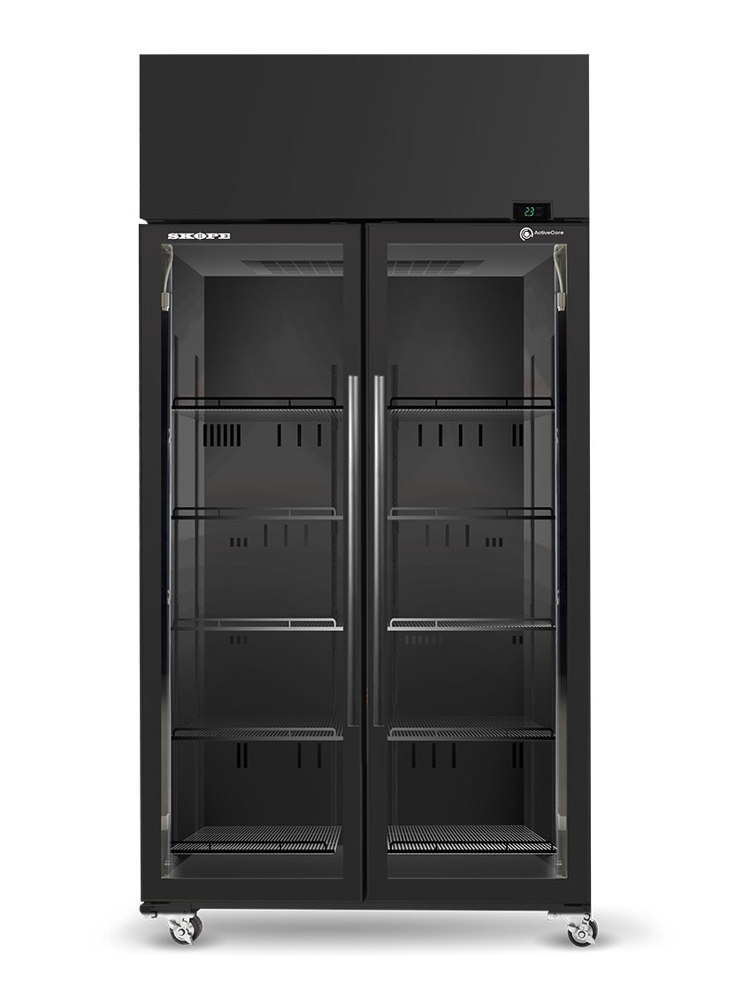 Skope SKT Active Core 2 Series Two Glass Swing Doors, 896Lt Self Contained Vertical Freezer with Top Mount Motor. Finished in Black. (10A)