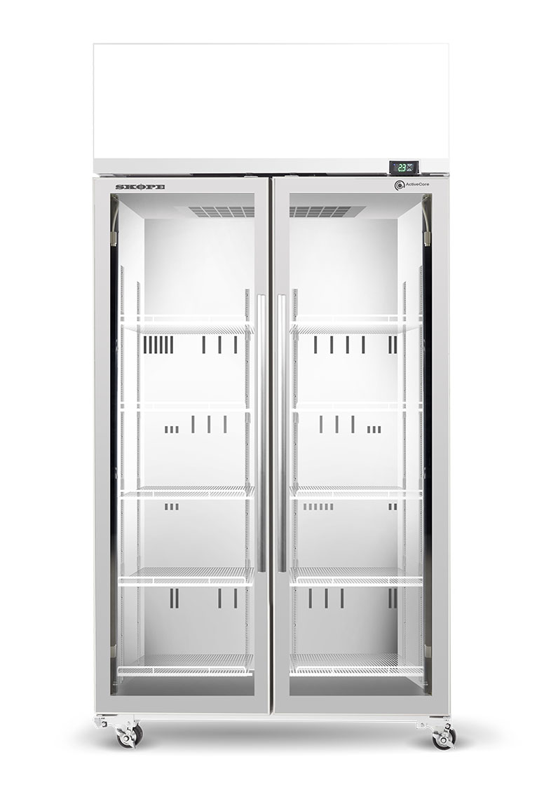 Skope SKT Active Core 2 Series Two Glass Swing Doors, 896Lt Self Contained Vertical Freezer with Top Mount Motor. Finished in White. (10A)