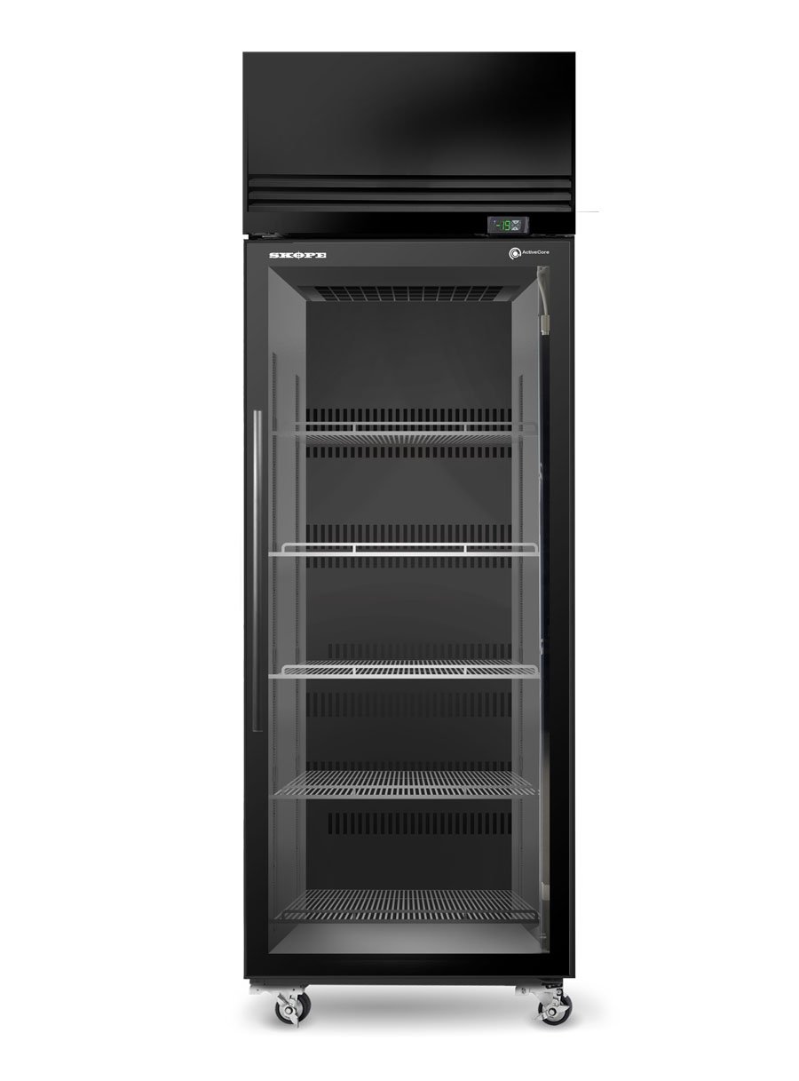 Skope SKT Active Core 2 Series Single Glass Door, 610Lt Self Contained Vertical Chiller with Top Mount Motor. Finished in Black. (10A)