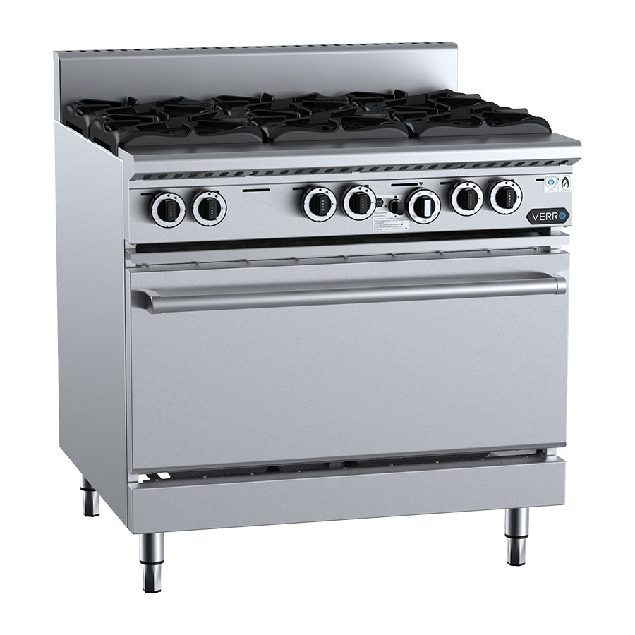 Verro Premium Fusion Series 900mm Gas 6 Burner Range with Full Size Static Oven Under. (NAT Gas)