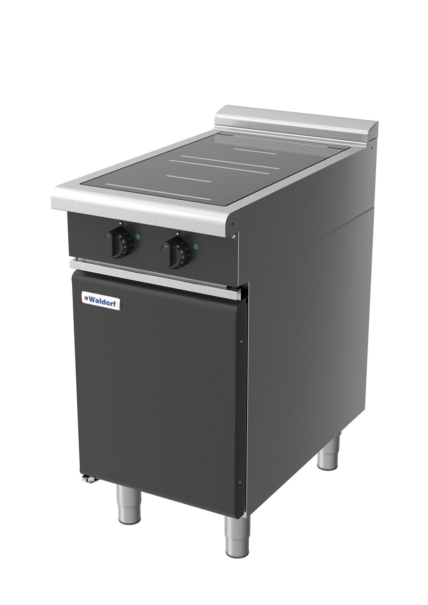 Waldorf BOLD 8200 Series 450mm 2 x 5kW Round Zone Electric Induction Cooktop on Cabinet Base with Doors and Low Height Splashback. Finished in Black. (3P)