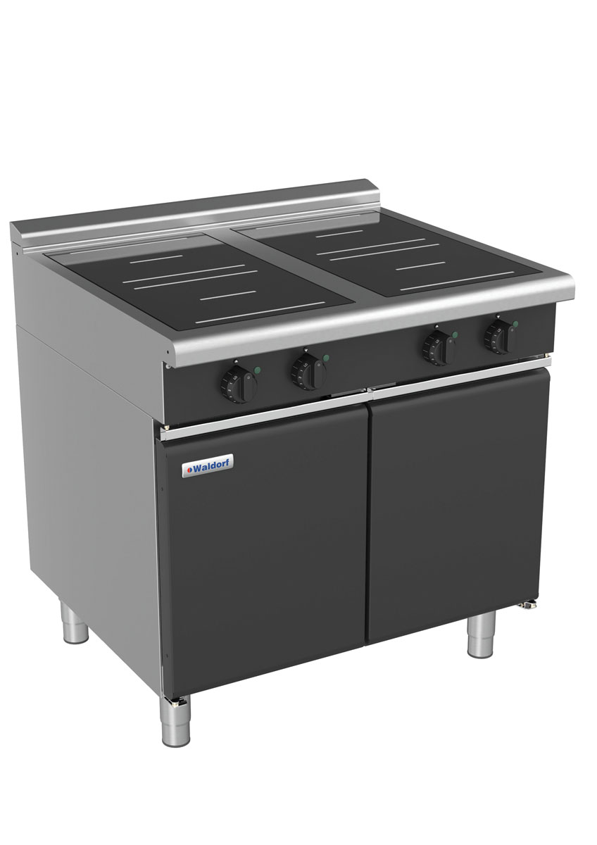 Home Shop Commercial Cooking Equipment Induction Cooking Freestanding Waldorf BOLD 8400 Series INLB8400R5-CD-BLK 900mm Four Round Induction Cooktop on Cabinet Base with Doors and Low Height Splashback in Black