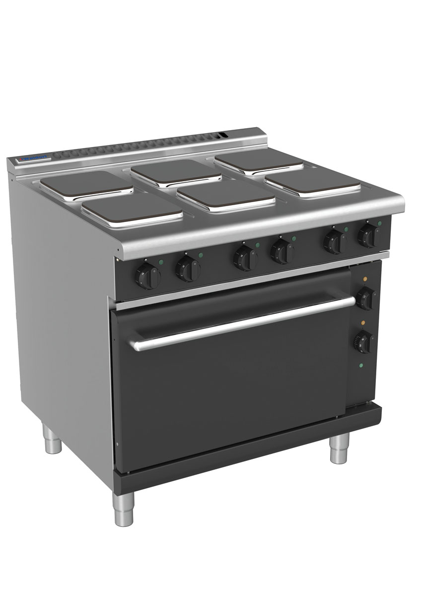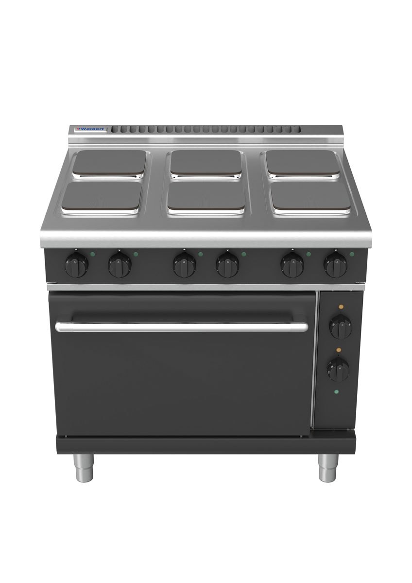 Waldorf BOLD 8610 Series 900mm 6 x 2.6kW Electric Cooktop on 2/1 GN Static Oven with Sealed Hobs and Low Height Splashback. Finished in Black. (3P)